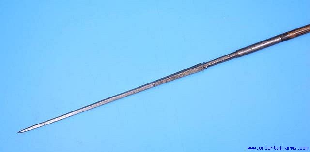 We offer here for sale a very good North African (?) spear, of much higher quality common to African pole arms. Head of diamond cross section 27 inches long, with nice brass bars and chevron design inlaid to the on the steel of the head and the heel. Total length 75 inches, , heel 23. Very good condition. Excellent wood patina. |