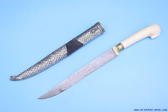 This Turkish Kard shows some characteristics of Balkan weapons, may be Albanian. The blade is forged of fine wootz ( Damascus) steel and is 10 inches long, with a 3 inches clipped tip. The grip is walrus with down curving pommel and brass bolster. Wood scabbard with big chased silver locket and chape with scales design and Dolphin shaped tip. Very good condition with minor pitted spots on the blade. |
