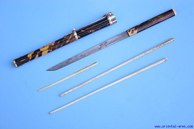 A Chinese ‘trousse’ (eating set), comprising a knife two chopsticks and a toothpick. This type of sets was very common in China and in all the countries under the Chinese influence from Tibet to Mongolia. It was part of a man formal dress up to the turn of the 20th century and usually accompanied with a variety of accessories like pickle spear, toothpicks, tweezers and the like. Similar sets are found in various sizes and quality. Such sets were quite rare and only with the liberalization in China; start to appear in the Western world. This one is a good quality. The blade is slender, 6 inches long, forged from good laminated steel. The grip is wood covered with tortoises shell The scabbard is wood also covered with tortoises shell. The chopsticks and toothpick are made of bone. Total length 10 inches. Good condition. Very attractive price. |