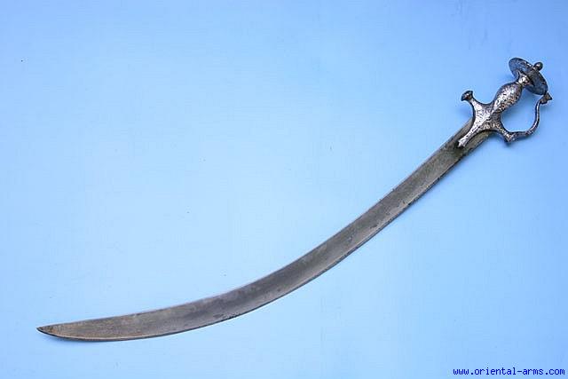 A fine sword, with a 28 inches blade, wide and heavy, forged from fine pattern welded (Damascus) steel. 10 inches back edge. Whole steel handle richly decorated with fine silver inlay in an intricate floral design. Total length 32 inches. Very good condition. Minor blackened spots on the blade. More than 95% of the silver work is intact. No scabbard. |