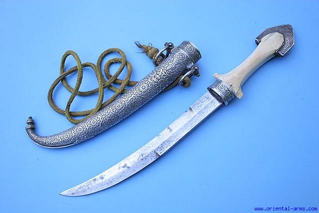A fine Moroccan Koumaya dagger, with a very good and heavy blade signed W. Singleton & Co., Sheffield. The blade is marked on the other side with an engraved harbor view (?) in a circle. The handle is carved from a massive piece of elephant ivory and set with chased silver pommel. The scabbard is also made of finely chased silver, in a classical Moroccan decoration style. Total length 16 ½ inches. Although not dated, the silver work and the grip patina suggest a mid to late 19 C. dating. |