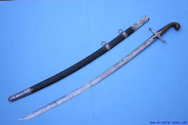 Up for sale is this 19 C. Turkish Shamshir sword, with a military issue blade, for use by high ranking officers in the Turkish army. The blade is light, 32 9nches long, with shallow fuller. The grips are cut from Rhino horn with a very nice engraved silver cross guard and silver grip strap. The scabbard is covered with its original black leather stitched with the classical spiral stitching. The scabbard fittings are silver, with the locket marked with the period Tugrha of the ruling sultan. The scabbard tip is steel with gold koftgari decoration. Total length 38 inches. Very good condition. Minor damages and repairs to the scabbard locket. |