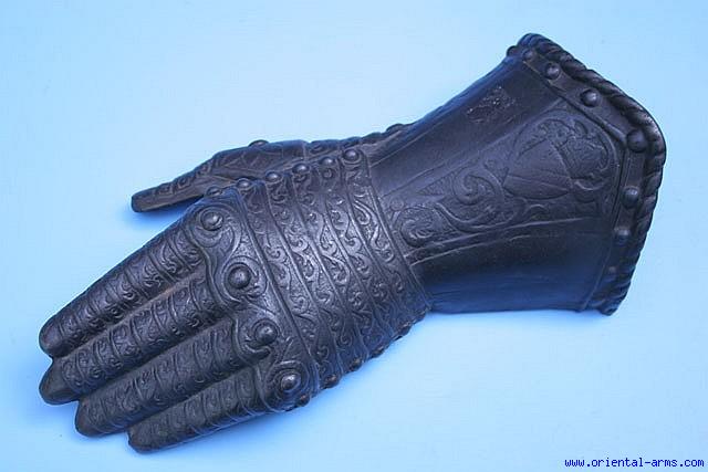 A 19 C. cast copy of earlier hand armor. Fine cast details, 11 inches long, 1550 Grams weight. Very decorative piece.