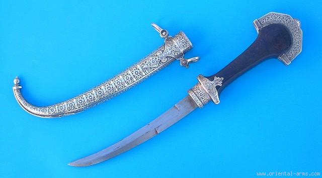 The Moroccan version of the Arab Jambiya dagger is locally called Koumaya and characterized by a slender blade, usually dual edged at its lower half and single edge at the top. There is a big variety in the decoration styles and quality of the handles and scabbards. This one is dated on the back of the scabbard to 1358 ( 1939 in the Gregorian calendar). Blade of good quality, with a 8 inches long. Very fine and heavy engraved silver scabbard with typical floral design with side loops. A maker ( or owner ? ) name is also engraved on the rear of the scabbard. The hilt of carved wood with chased and engraved silver fittings . Total length 16 ¾ inches. Very good quality and condition. |