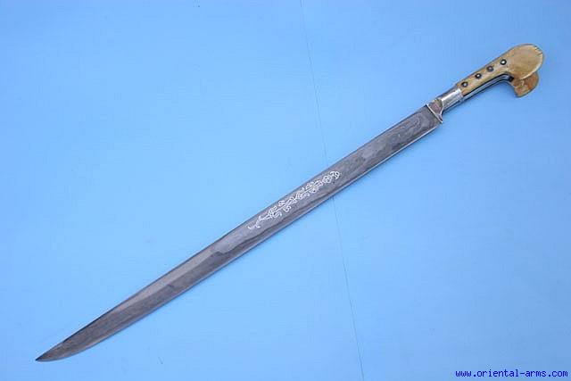 Up for sale is this early Yataghan, although not dated it is probably a late 18 C. item. The blade is straight, 22 inches long, forged from fine folded steel with heat hardened edge. The blade is decorated in a classical period style with true silver inlay. The grips are elephant ivory on thin layer of black horn, riveted to the tang with steel rivets and black horn rondels. The silver grip strap and bolsters are ( restored). Total length 27 inches. Very good condition. No scabbard. |