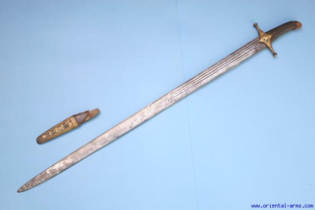Up for sale is this rare Georgian sword, from the first quarter of the 19 C. This sword is a part of a small collection purchased in Jerusalem in 1918 and was in private hands in the U.S.A since than. Straight single edge blade 31 inches long with three fullers. A styled, crude version of the running wolf, the famous mark of high quality blades from Passau and Solingen in the 15 and 16 C., is engraved here on the blade, as a mark of quality. Wood grip covered with the original black leather. Steel cross guard beautifully inlaid with gold with typical Georgian lion in the center. The scabbard tip is also decorated with a similar design. Total length 36 inches. Good condition. Blackened areas on the blade and pitted tip. The pommel is missing. The scabbard is unfortunately missing and only the original steel tip with some remains of the scabbard wood survived. A fine Rare piece, sought after by collectors. |