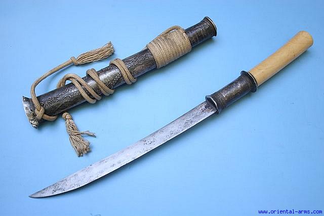 Up for sale is this big and interesting Dah short sword / dagger, with a typical single edge heavy blade almost 12 inches long set with three copper rondels in the blade. solid ivory hilt with good age patina and nicely decorated silver collar. Silver covered scabbard. Original baldric carrying rope. Total length (In scabbard) 21 inches. Very good condition, a small damage to the scabbard tip. |