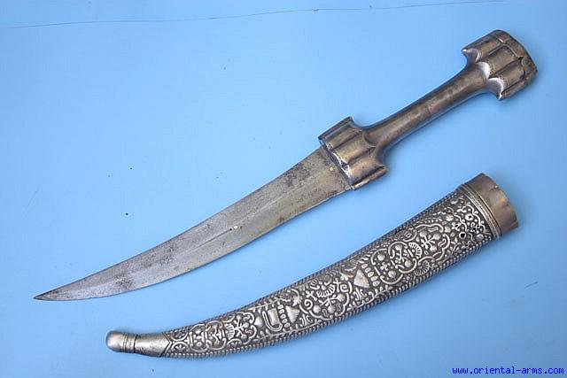 This Dagger of Ottoman / Balkan origin employ a very early, probably late 17 C. wootz blade with mid 19 C. handle and scabbard. The blade is 9 ½ inches long set with two brass rondels and central fullers. The handle is silver and so is the chased scabbard. Total length 18 inches. Very good condition. Blackened spots and shallow pitting on the blade. Minor dents on the hilt and scabbard and pierced small areas and lightly open seams on the scabbard. The scabbard top is restored. |