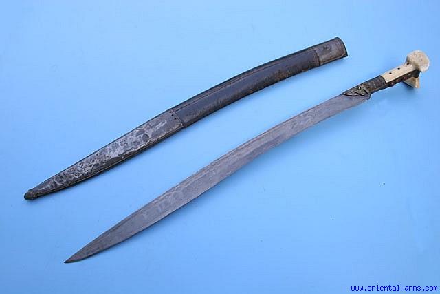 Up for sale is this early to mid 19C. Yataghan sword, probably from the Balkan areas of the Ottoman empire. 21 inches blade with two fullers along its spine, forged from laminated steel. Walrus ivory grips with gilded copper grip strap and bolsters, set with 6 round coral stones (one missing) and decorated with filigree work. Wood scabbard with its original leather cover and iron locket and chape. Very good condition. Minor damage to the top grip strap above the bolsters and few other small dents. Very attractive price. |