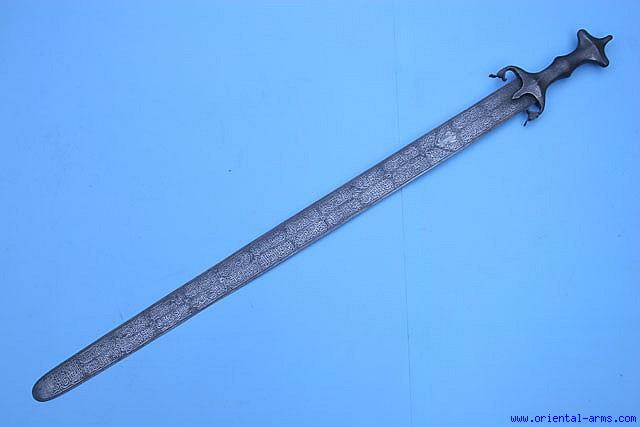 We offer for sale this beautiful 19 Century Persian straight sword also known as Revival sword, as it was reviving the use of old 15 C style Islamic straight swords. Quite a rare item and not frequently seen on the market. This beautiful blade is 33 inches long, 2 inches wide at the top, and although thin is very solid and both edges are sharp. The entire blade is elaborately etched on its two faces in the typical Qajar style with Arabic inscription and one central human figure. The hilt is steel, with down curving quillons, and was decorated with silver koftgary, now mostly gone. Total length 40 inches. No scabbard. Very good condition. |