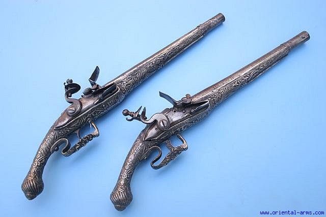 This good pair of pistols is coming from Greek or Albania, early to mid 19 C. Almost identical 11 ½ inches long barrels with flintlock locks and elaborate silver mounts in high relief. Total length 17 ½ inches. Barrels in good condition. Locks in good working condition (one needs slight adjustment), trigger guard are a later replacement. |