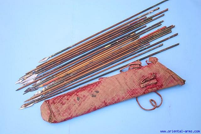 This nice set is of Indian origin, late 18 or early 19 C. It includes a leather made quiver covered with red fabric and containing 20 real arrows: 9 hunting arrows with small steel tips, 6 battle arrows with bigger head and thickened tip to penetrate armor and 5 training or targeting arrows. The shafts are made of bamboo for the hunting and fighting arrows and wood for the training ones. Arrow length 26-31 All arrows shafts are painted in various colors on the r heads and tails. Very good condition. Very few arrows are broken or damaged. The quiver fabric is lightly worn. |