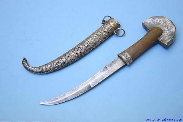 Up for sale is this good Koumaya Dagger early 20C, probably 1920 - 1930 from Morocco. Classical blade, 9 inches long, double edged at its lower half and single edged at the top. The handle is carved from a single piece of Rhino horn with a very clear fibrous structure. The pommel head is chased silver as well as the grip collars and scabbard. Total length 16 ½ inches. Good condition. The silver pommel has few dents and small cracks. |