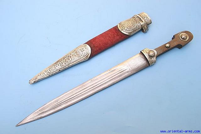 Up for sale is this Kindjal dagger, made by Zlatoust the famous Russian blade manufacturer and which was issued to the Kuban Cossack troops in the early 20 C. 12 inches blade, etched with the Zlatoust marking and the letters ZOF (In Cyrillic letters), standing for Zlatoust Weapon Factory and KKV (also in Cyrillic letters) standing for Kuban Cossack Army) . The blade is dated to 1902. Horn grips with white metal mounts. The scabbard is covered with red fabric and also mounted with white metal mounts with traces of Niello enameling. Total length 17 ½ inches. Good condition. A crack in the middle of the front grip, but it holds solid. Nicks and cracks on the metal mounts. Damaged scabbard tip. |
