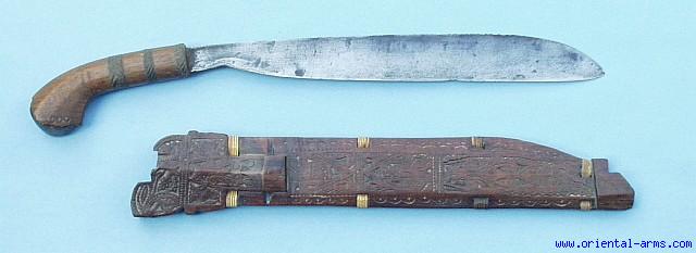 An interesting Bolo Knife / machete from the Philippines. Heavy blade somewhat crude, 15 inches long, straight single edge and down curving spine. Wood hilt bound with natural fiber and beautifully carved wood scabbard. Very good condition some blackened areas and small edge damage. |