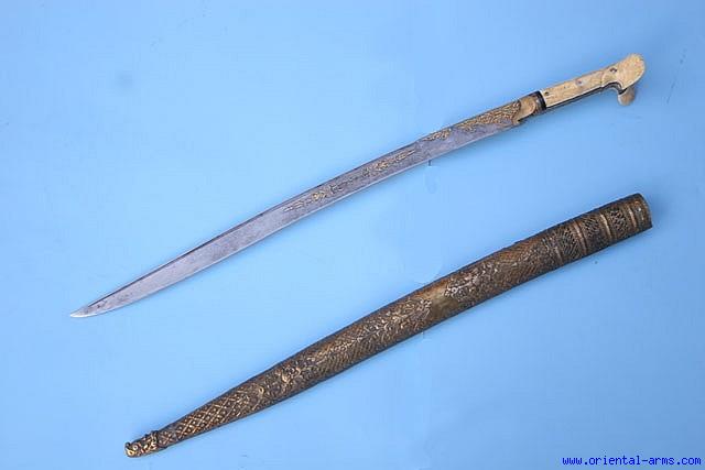 This fine piece is dated in gold inscription to 1241 (1825 in the Gregorian calendar) on the 21 inches blade. The bolsters as well as the grip strap are also decorated with gold koftgari work. The walrus grips are riveted to the tang through narrow black horn spacers. The silver scabbard is finely chiseled and gilded. Total length 27 inches. Very good condition. The walrus grips were cracked and were repaired. They are later to the blade and the black horn spacers were added to fit it to the tang. The tip of the scabbard was broken and re-glued. Very little of the gold inscription on the blade and the gilding on the scabbard are erased. A very fine piece. |