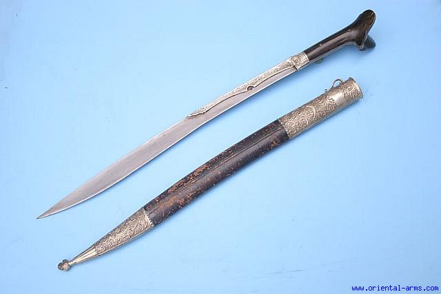 This fine Yataghan sword is coming from the collection of The Royal House of Hanover, Germany, Sold recently. The blade is 20 ½ inches long, forged from very fine pattern welded steel in the pattern known as Turkish Ribbon and marked with a maker mark. The grip strap and very long bolsters are engraved silver and the grips are dark horn. The scabbard is wood, covered with the original leather and mounted with very finely chased white metal mounts. Total length 28 inches. Very good condition. A fine and complete piece. |
