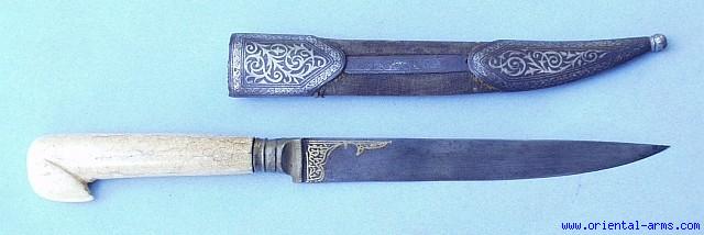 This is a nice an interesting Kard knife, Balkan, probably from Albania. The blade is straight, single edge, 6 ¾ inches long decorated with gold koftgari. The grip is a single piece of walrus ivory, carved from the inner core of the tusk and showing the clear marble like structure of the ivory. The bolster is brass (clear Ottoman influence). The scabbard is wood covered with the original green velvet (faded and worn) and the locket and chape are steel inlaid with silver wires in a very typical ottoman style. The Albanian attribution is derived from the pommel shape of the hilt, which has resemblance to the classical Albanian jambiya’s hilts. Very good condition. |