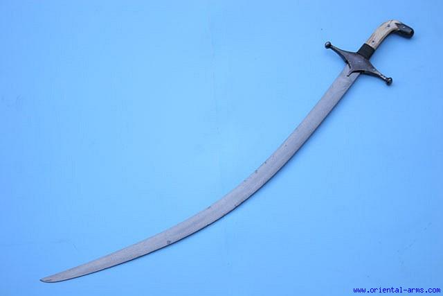 A Shamshir made for a boy, all in the right proportions but a smaller version of the Eastern saber that for centuries enchanted the world and was copied in practically all armies of the western world. A light. Deeply curved, wedge shape blade of minimal and simple design 24 inches long, forged from a Wootz (watered steel, Damascus) with gold inlaid cartouch (true inlay) with the maker name and a Badouh, the magic squre with Arabic numbers in gold inlay. Steel cross guard, bone grips and steel grip strap and pommel. Total length 29 inches. Very good condition. The hilt restored. The pommel cap is later. |