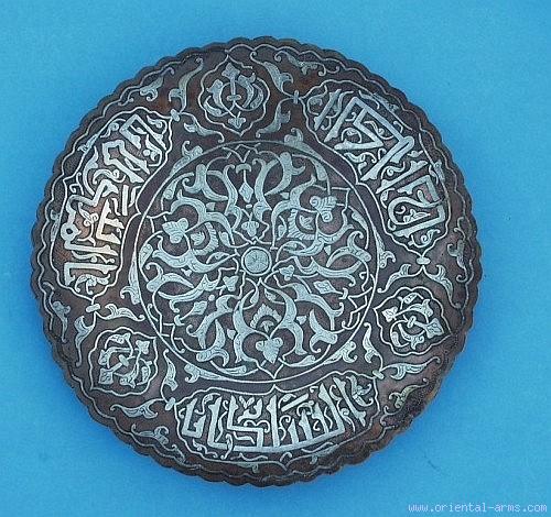 A most beautiful 19th C. copper plate with very rich silver inlaid decoration. The plate is more 10 inches in diameter, beautifully, intricately and richly inlaid with floral decoration and Kuftic Arabic script in heavy silver This type of work is known as ‘Damascus work’, but may have been produced in other countries in the Middle East beside Syria. Very good condition.
