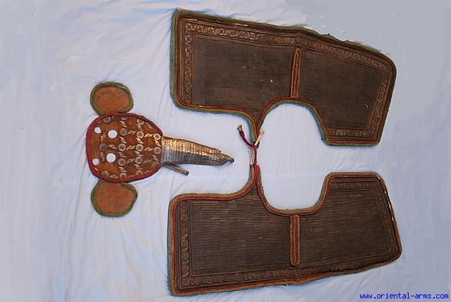 Up for sale is this unusual and complete parade horse armor, India, mid 19 C, including the two side plates and head armor. The sides are composed of thousands of steel scales sewed on a thick fabric and decorated with steel bosses and brass rosettes all around. Most interesting is the head cover, made of thick leather and cut in the shape of an elephant head with a trunk made from many small steel scales. Also included are two tusks made from steel. Dimensions: 77inches long, 33 inches tall each side. Weight total more than 50 pounds. Very unique piece. Price includes airfreight cost to final destination. |