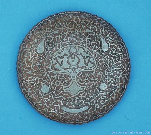 A most beautiful 19th C. copper plate with very rich silver inlaid decoration. The plate is 10 inches in diameter, beautifully, intricately and richly inlaid with floral decoration in heavy silver. This type of work is known as ‘Damascus work’, but may have been produced in other countries in the Middle East beside Syria. Very good condition.