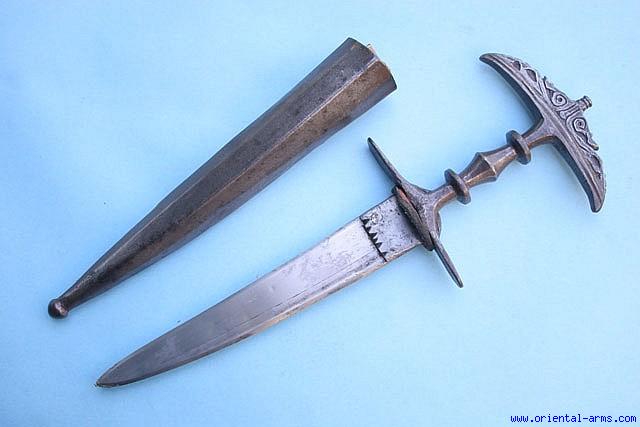 The Jamdhar Katari is of unusual form of a dagger in the Indian arsenal. It was popular in North West India in the 16 C. and on. This one is late 18 or early 19 C. Piece, very slightly curved blade 7 ½ Inches long. The blade is riveted to the whole steel handle with wide pommel nicely chiseled and a wide cross guard. This piece comes with its original steel scabbard and wood liners, opened in the back side. Very good condition. Total length (in scabbard) 13 Inches. |