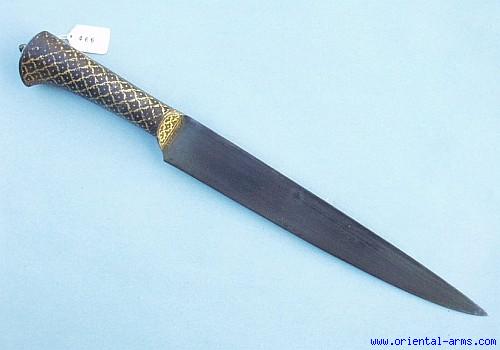 Whole Steel Kard, probably of Afghani origin. 9 ½ inches blade of good wootz. The grip is steel decorated with koftgary gold design.