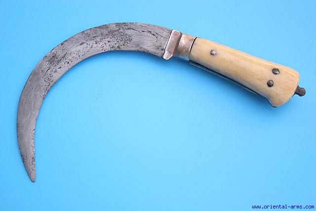 The Bank Is a rare type of an Indian sickle shaped knife used by the Mahratta. It has its edge on the inner curved side of the blade. This specimen is 5 ½ inches wide (Point to point), laminated steel blade, 3” long bone grips riveted to the blade tang and silver bolsters. Good condition. Some pitted spots on the blade. the bolsters are later. No scabbard. |