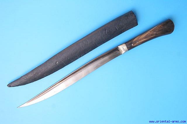 Up fr sale this nice Turkish knife probabbly from Trabzon area. The 12 incehs well forged blade has nice fuller and filed spine. Horn handle and WM bolsters. Total length is 17 inches. It is a good quality Turkish knife from 1920-1940.