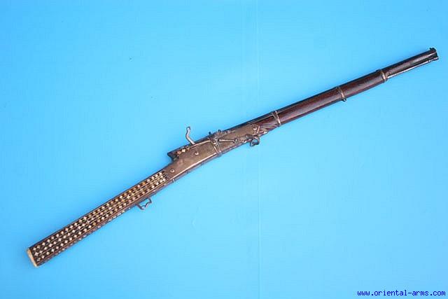 This fine piece was made for a rich boy, a prince or a youngster of a very wealthy Indian family. Full working matchlock, 18 inches steel barrel with flaring muzzle, wood butt set with many ivory stars and mounted with gilded silver palates. Total length 34 inches. Very lightweight but in full working condition. Very good condition. The pan cover is missing. A fine piece. |