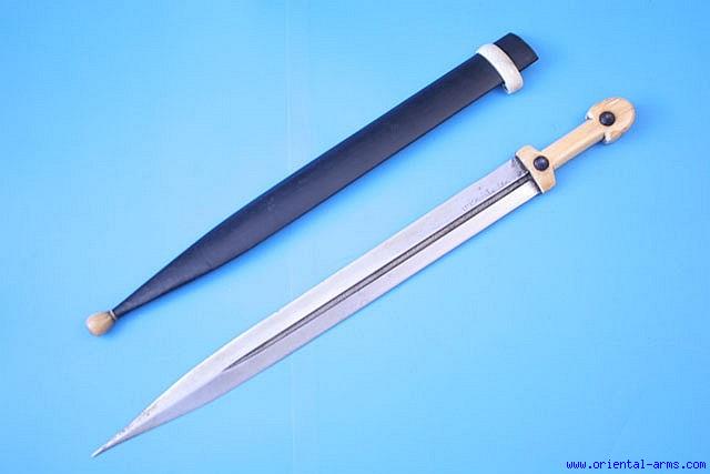Up for sale is this very good Qama dagger / short sword, with a classical blade with off centered fullers, marked and dated 1332 ( 1913 in the Gregorian calendar). The blade is 21 ½ inches long and the fuller is etched in a typical floral pattern. The handle is cut from a massive piece of walrus ivory, riveted to the blade tang with big steel rivets. Leather covered scabbard with bone tip and bone belt ring. Total length 27 ½ inches. Very good condition. The scabbard and bone fittings are later to the blade, probably late 20c. An impressive piece. |