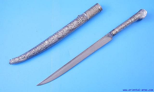 Up for sale is this small attractive Yataghan style Knife. Turkish origin, second half of the 19 C. 11 inches blade 16 inches total length, Very Nice silver handle and scabbard with dragon shaped tip. Very rare Persian wootz steel, hardly found on Yataghan blades. Very good condition. |