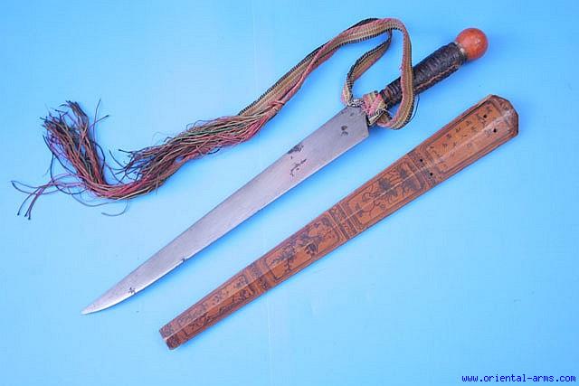 A knife of the Taiwanese people - a very fine example of a very rare knife. The heavy single edge blade is 17 inches long. The handle is forged in one piece with the blade and covered with braided rattan strips. The pommel knob is painted wood, plugged into the top opening of the tubular handle. The sheath is wood delicately painted and inscribed in Chinese. It is half open with a beautiful grid of brass wire holding the blade in position.. Total length 26 ½ inches. Very good condition. Minor damages and losses to the rattan binding of the handle. Minor cracks and wood chips on the scabbard. A fine and rare mid 19 C. Authentic knife. |