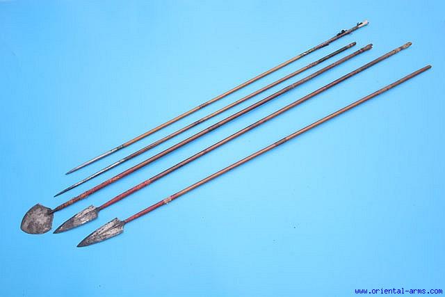 Up for sale is thi vser interesting lot of five old 18 C. Indian arrows. It includes two fighting arrows with beautifully forged 4 inches long steel heads, two armor piercing arrows and one very wide head 2 1/2 X 2 1/2 inches hunting arrow. Length 28 -32 inches. Very good condition to age. Some pitted spots on the blades. Two of the arrows misses the tail end. Very low price. |
