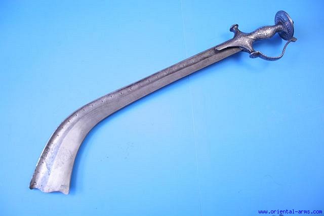 Up for sale is this very good Indian version of the famous Nepalese Kora sword. It is a fighting sword and smaller than it Nepalese sacrificial Kora sword. The down curving blade is 20 inches long, widening to 4 inches at the down dropping blade tip. It is well forged, fullered to its entire length and marked along its spine. The markings reminds those of the Nepalese armory marking on Khukuri knives. The handle is a Tulwar style with rich silver koftgari decoration. Total lengtgh25 inches. Very good condition. This Kora is coming from the collection of John Powell, SF, a world known collection of Nepalese and related weapons. |
