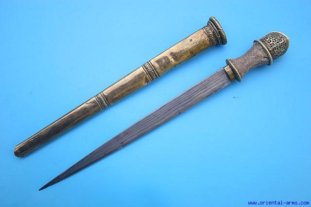 Up for sale is this very fine and elegant dagger from Tibet. A stiletto style acute heavy blade, 11 ½ inches long, forged from laminated steel folded at the tip in the pattern known as Hairpin. Grip covered with rye skin. Beautifully pierced and chased brass pommel. Brass scabbard. Total length 15 ½ inches. Very good condition with minor pitted spots on the blade tip. Cracks and repairs on the skin cover of the grip. Minor dents on the brass scabbard. This is a real and authentic late 19 C. piece, NOT one of the many tourist souvenirs daggers from Tibet recently flooding the market. |