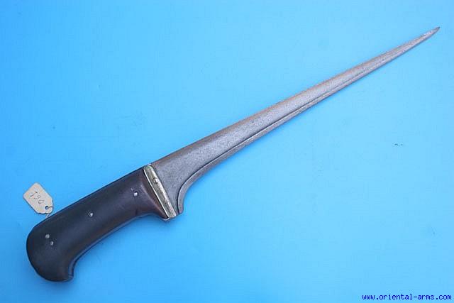 From our private collection, this Karud dagger is the straight back member of the family of the Pesh-Kabz, Choora and Khyber Knife. The whole family of such daggers is common to India, Persia and several Central Asian countries. The blade is forged from beautiful high contrast wootz (Damascus) steel, 10 inches long, heavy, with a pronounced T spine tapering to an acute tip. The grips are Rhino horn with a pronounced fibrous structure cut axially to the horn. The grip strap is steel and the bolsters silver. Total length 14 ½ inches. This very typical horn grips indicate a Bukhara origin. Very good condition. No scabbard. |