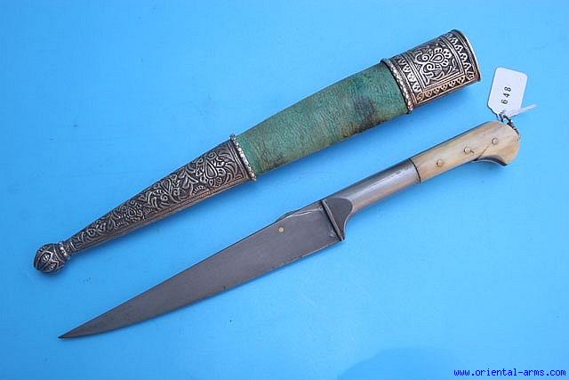 Up for sale is this 19 C. small Kard dagger with wootz blade, 6 inches long, forged from wootz (Damascus) steel. The hilts is composed of long steel bolsters and ivory grips. Original scabbard with green leather cover and finely chased silver locket and chape. Total length 11 inches. Very good condition. Minor forge flaw on the blade heel. A nice complete piece. |