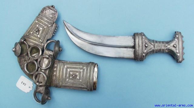 This one comes from our private collection: a very fine top quality Arab Jambiya (the Arabic word for a dagger mounted on the hip) from the early 20th C. This style of daggers with the “L” shaped scabbard is called Omani, as its originate from Oman. However it is spread as well as other Jambiya’s styles all over the Arabian Peninsula. It has a 7 inches curved and dual edge blade with a pronounced central rib, forged from good steel (not like many new Jambiya’s on the market whose blade are made from two-iron sheet pressed to form and welded together). The hilt and scabbard are elaborate silver filigree work. The belt attachment is made of a RARE complicate arrangements of SEVEN heavy silver rings and twisted silver wire. Very good plus condition. The blade has only superficial pitting and there are some minor dents to the silver parts, mostly in the hilt. The scabbard velvet cover is a later addition that comes to replace an older worn one. This is not a low price item but considering its rarity and condition it is a recommended superb, unusual piece for the connoisseur collector of Arabic weapons / |