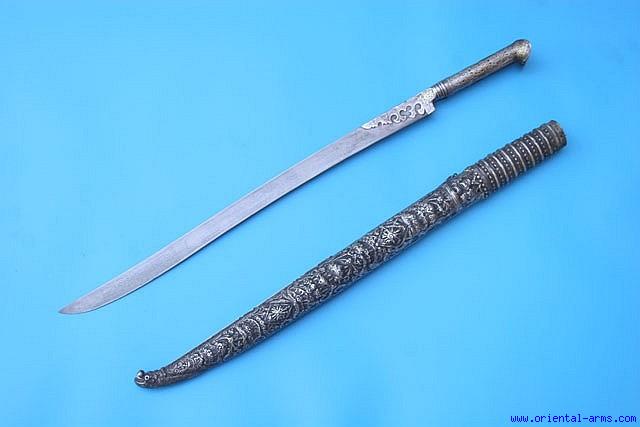 Up for sale is this very fine yataghan sword, probably of Turkish origin and late 18 to early 19 C Fine blade, forged from Sham wootz (low contrast Damascus steel), 19 ½ inches long. Finely engraved silver grips and grip strap, with Arabic letters on the spine of the bolster. Very fine chased silver scabbard. Total length 27 inches. Very good condition. The pommel cover is restored. |