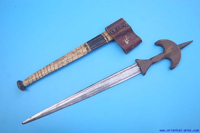 From southern Sudan or nearby areas comes this rare form of arm dagger. Fine 14 inches steel blade lightly engraved with geometrical pattern. Big handle with a lunette shaped pommel carved from Rhinoceros horn with clear fibrous structure. Scabbard covered with Crocodile skin with leather arm loop. Total length 22 inches. Very good condition. |