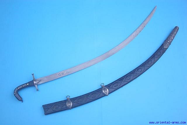 A very fine Shamshir from Syria. The blade is forged from wootz (Damascus, watered steel), marked and signed with the maker sign and decorated with gold inlay work. It is 32 inches long, curved and single edged, most probably of Persian origin. The cross guard is steel. The ‘Syrian’ attribution comes mainly from the shape of the hilt. The grips are horn inlaid with brass and lead dots and decorated with brass nails. The cross guard is secured to the grips with a twisted steel wire. The pommel is steel and it is sharply down curving (very typical Arab style). Wood scabbard covered with tooled black leather , pierced steel belt fittings and chased silver tip. Total length 38 inches. Very good condition. Minor edge nicks and blackened spots on the blade. Cracked pommel cover. |