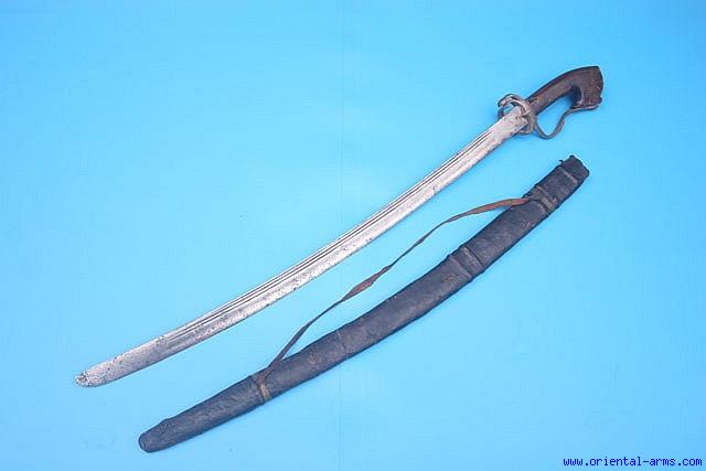 A very unusual and interesting Arab sword, also known as Saif. It reminds the famous Moroccan Nimcha, but although the hilt style is similar, this sword is coming from the South Arabian peninsula, and it is believed to be produced in the island of Zanzibar in the 19th C. The single edge blade is very slightly curved, 30 inches long with a short 6 inches false edge. The grip is cut and beautifully shaped from a solid piece of Rhino horn. The hilt is of unusual design and has a big steel ring forged in one piece with the cross guard and the “D” guard. This sword comes with its leather covered scabbard. Total length is 36 inches. Good condition. The tip of the blade is lightly damaged and rounded. There are some beetle damages to the handle’s horn and its metal collar is missing. Some little losses to the leather cover of the scabbard. The attribution to Zanzibar comes from the characterized design of the hilt but we could not find any substantiation to this. |
