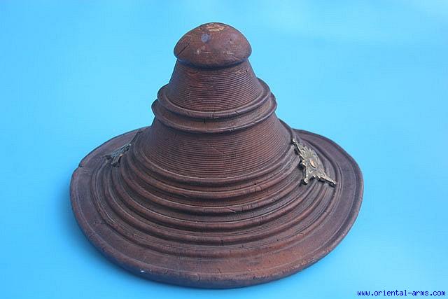 This is a Buckler (hand shield) from the horn of Africa. It is 9 ½ inches in diameter, 6 inches in height. It is made from a thick hide of the Hippopotamus almost 3 / 4 inches thick and in this thickness it will stop a bullet from a small caliber pistol. The fittings are brass. Very good condition . Minor distortions due to age shrink of the hide. These type of shields were sought after in all the area and were traded all the way from Africa through Zanzibar to Oman. |