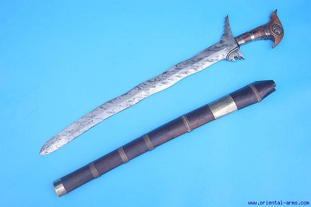 Up for sale is this good Moro Kris sword, a real weapon meant for business. Heavy 22 ½ inches wavy blade, deadly sharp, fine grained wood handle with steel blade clamp and white metal bands. A medallion showing a warrior head wearing an helmet is attached to the pommel on both sides. Wood scabbard with white metal and rattan bands. Total length29 inches. Good condition. The blackened lines on the blade are result of un controlled etching (??). The pommel medallion is probably a later addition (Spanish influence??). The rattan bands are recent. Very Low price |