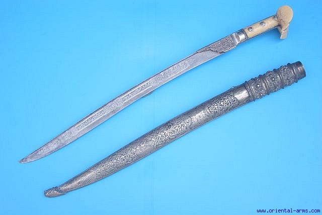The grips are fine massive walrus ivory with heavy silver grip strap and bolsters. Heavy chased silver scabbard. Total length 30 inches. Very fine condition. The grip strap and bolsters are restored. A fine impressive sword. |