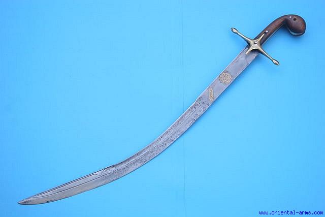 The Kilij is the traditional saber of the Ottomans. It was in use from the early 17 C. and during more than 300 years well into the 20th C. The shorter version with deeply curved wide blade and ‘T’ spine, sometimes also known as Pala, is a later version and appeared in the mid 18 Century. This Pala has a blade of 28 inches, well curved and forged from high carbon steel and decorated with gold koftgari inlay cartouches. The hilt of classical form is made of brass cross guard and rhino horn grips with bulbous pommel and brass grip strap. Total length 33 inches. Very good condition The blade has few blackened spots. The cross guard was riveted to the blade at some later time. No scabbard. |