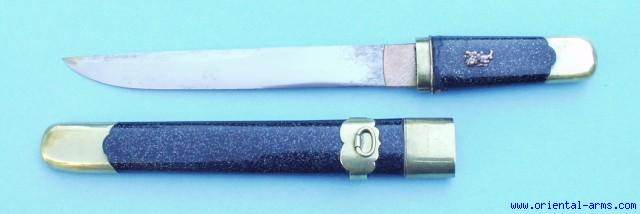This is a tanto of the Meiji period. The blade is 6 ½ inches long with 3 ½ inches false edge. Lacquered wood grip and scabbard and brass fittings. Good condition, minor areas of blade discoloration and minor losses to the lacquer near its edges (painted black by the knife previous owner). |