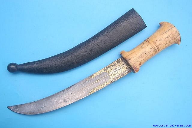 Up for sale is this early, probably mid to late 17 C. Jambiya Dagger from Turkey. The 9 ½ inches blade is forged from very fine Sham steel, a form of wootz steel used for blades in the Ottoman empire. This sham pattern is very clear and of high contrast. The blade was inlaid with gold and silver koftgari work. The handle is carved from the inner core of a massive walrus tusk. Wood scabbard covered with black leather and ball shaped horn tip. Very good condition to age. Few blackened spots on the blade and minor losses to the gold koftgari work. Minor old chips to the handle. The scabbard is much later to the blade, may be early 20 C. A fine rare item. |